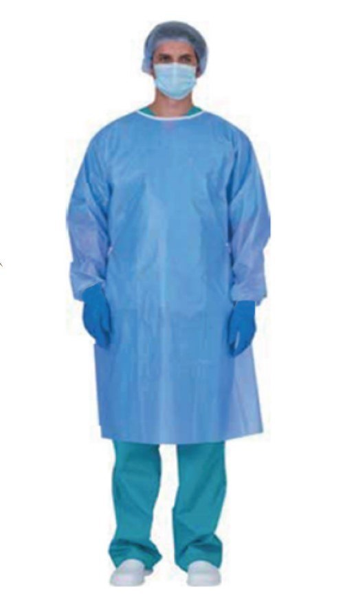 Fartuch izolacyjny, pełnobarierowy, wykonany z włókniny polipropylenowej powlekanej polietylenem.